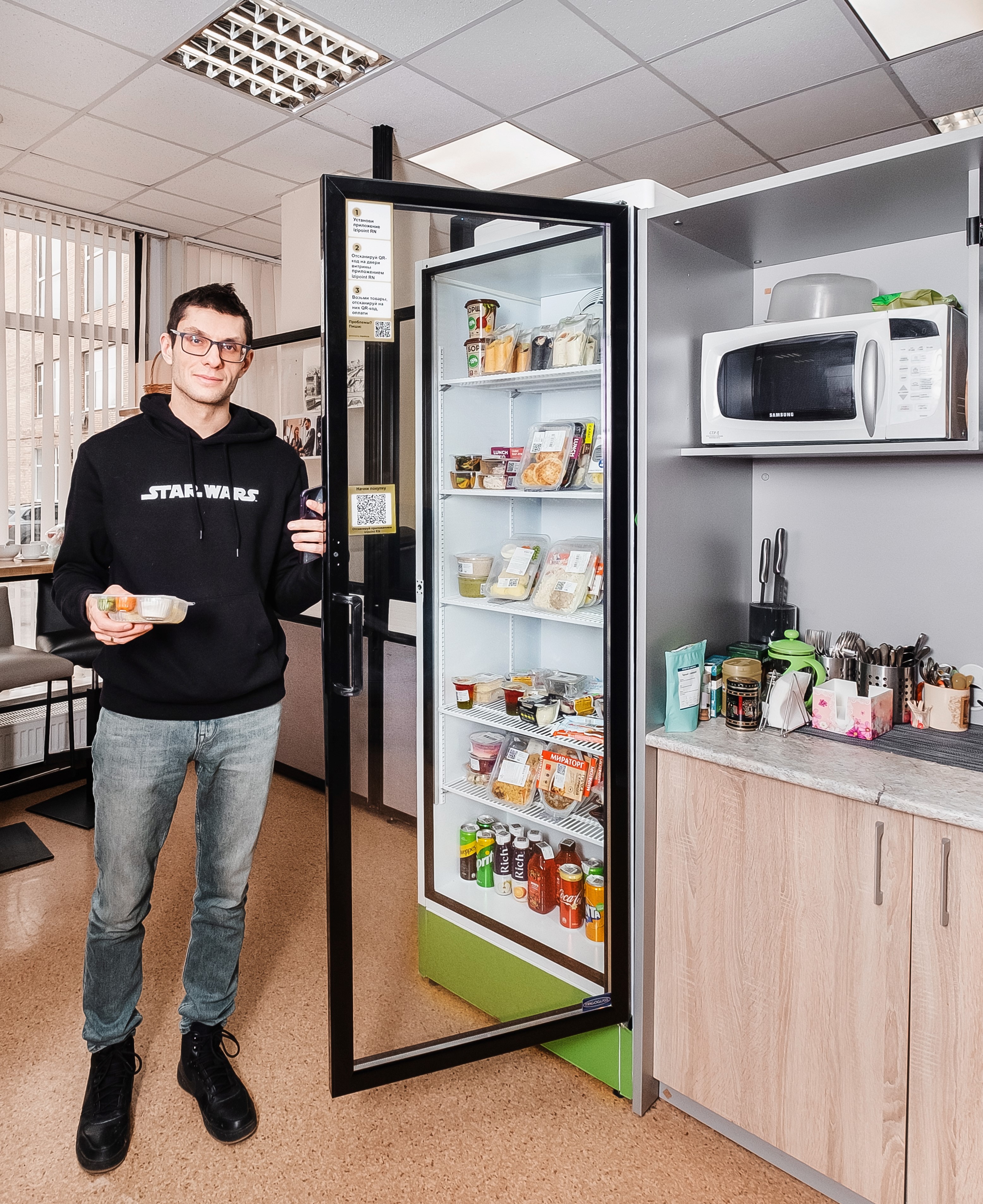 1. Open the app and scan the QR code on the cabinet, fridge or freezer. Scanning the code opens the doors of the cabinets, fridges and freezers.