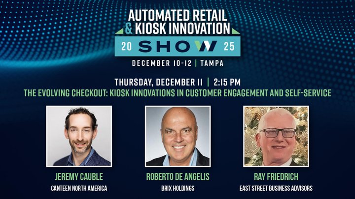 Cauble and Friedrich, along with Roberto De Angelis, chief experience officer at Brix Holdings, are participating in a panel talk, «The Evolving Checkout: Kiosk Innovations in Customer Engagement and Self-Service,» at the upcoming Automated Retail & Kiosk Innovation Show, being held December 10-12 in Tampa, Florida.