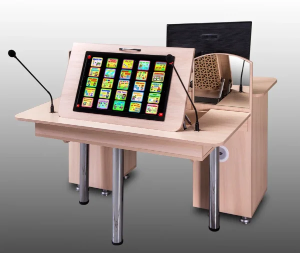 • Монолитный пульт управления интерактивным комплексом (USB-разъем, кнопка включения/отключения питания, кнопка включения/отключения аудио системы, включения/отключения микрофонной системы, тумблер управления громкостью, кнопка запуска ПК)